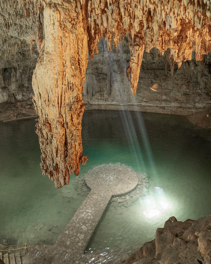 Cenote Suytun, situated 15 minutes from Valladolid, is a mesmerising natural wonder that captivates visitors with its unique features. Characterized by its crystal-clear waters and an enchanting beam of sunlight piercing through the cenote’s ceiling, Cenote Suytun offers a magical setting for exploration. Do take note that if there has been rain, that the centre platform will be covered but you can still swim there.